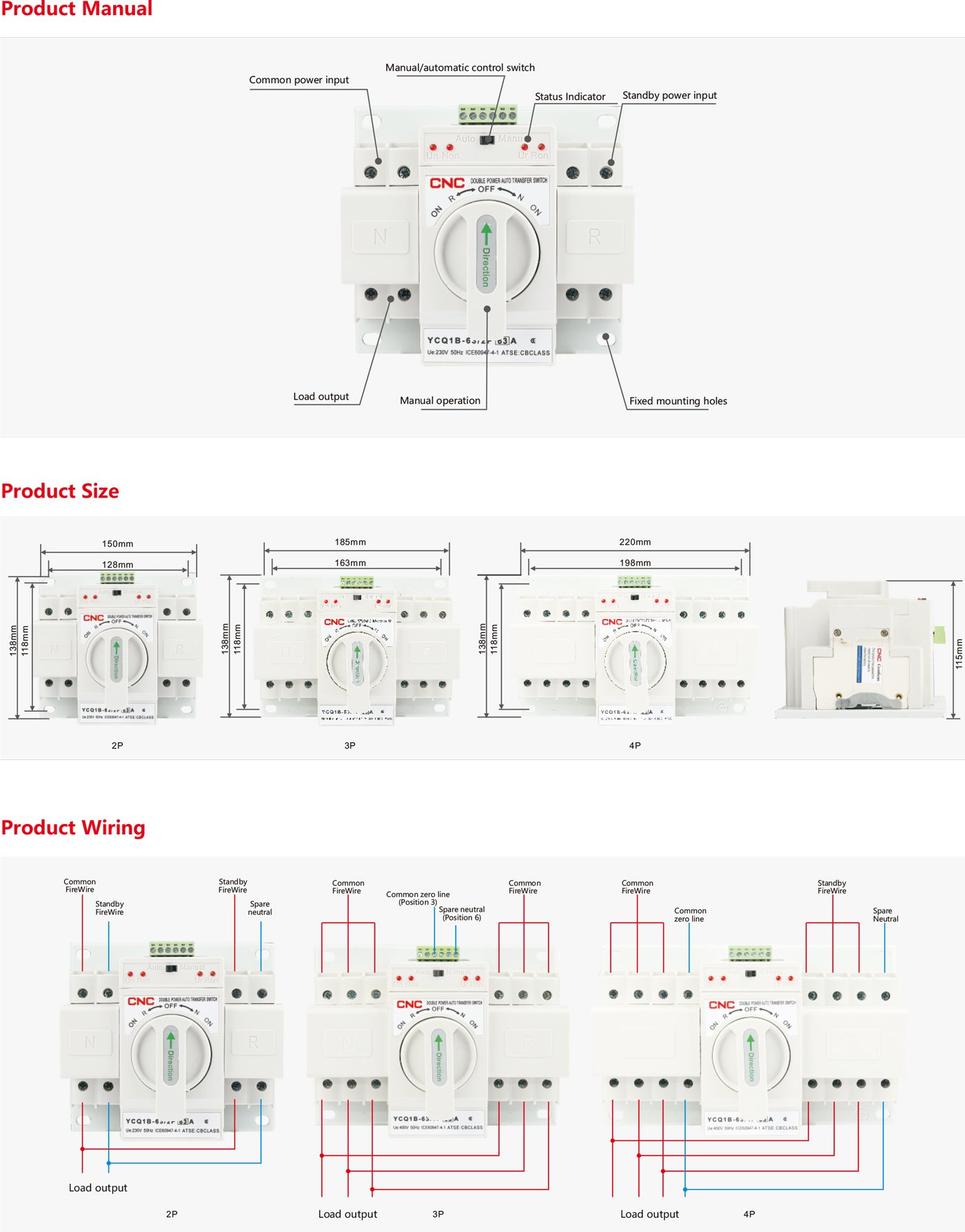 The dual power automatic switch is used to switch between two power sources. It is divided into common power supply and standby power supply. When the common power supply is powered off, the standby power supply is used. When the common power supply is called, the common power supply is restored), if you do not need automatic switching in special circumstances, you can also set it to manual switching (this type of manual / automatic dual-use, arbitrary adjustment).